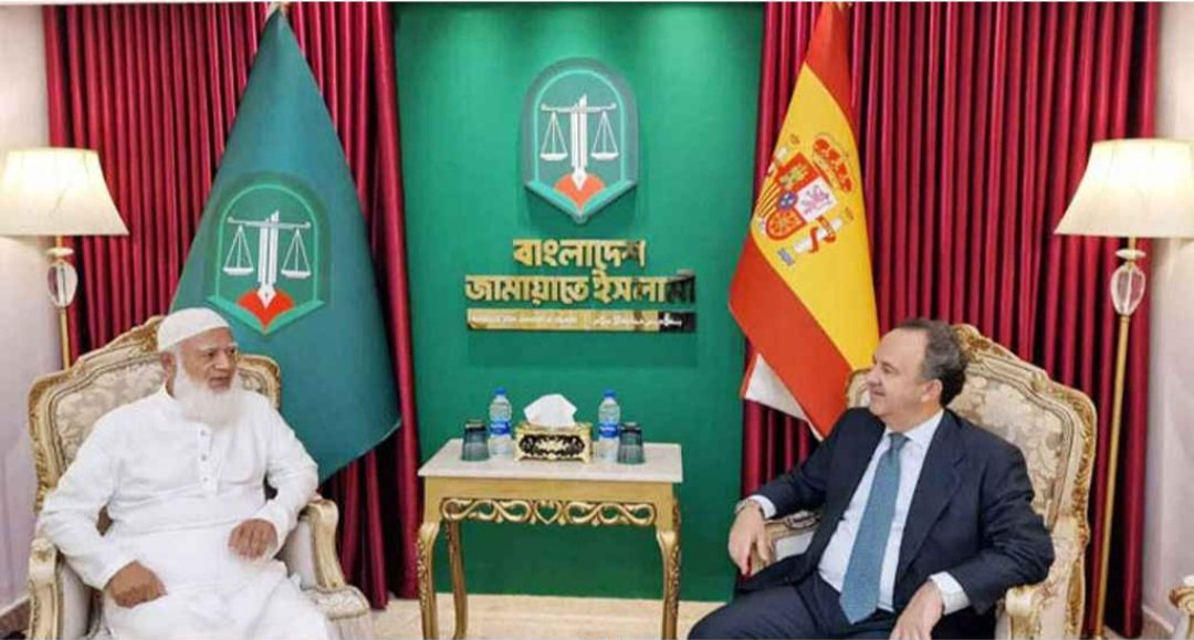 স্পেনের রাষ্ট্রদূতের সঙ্গে জামায়াত আমিরের বৈঠকের সময় পেছনে দলটির নতুন লোগ এবং পতাকা দেখা যায়।