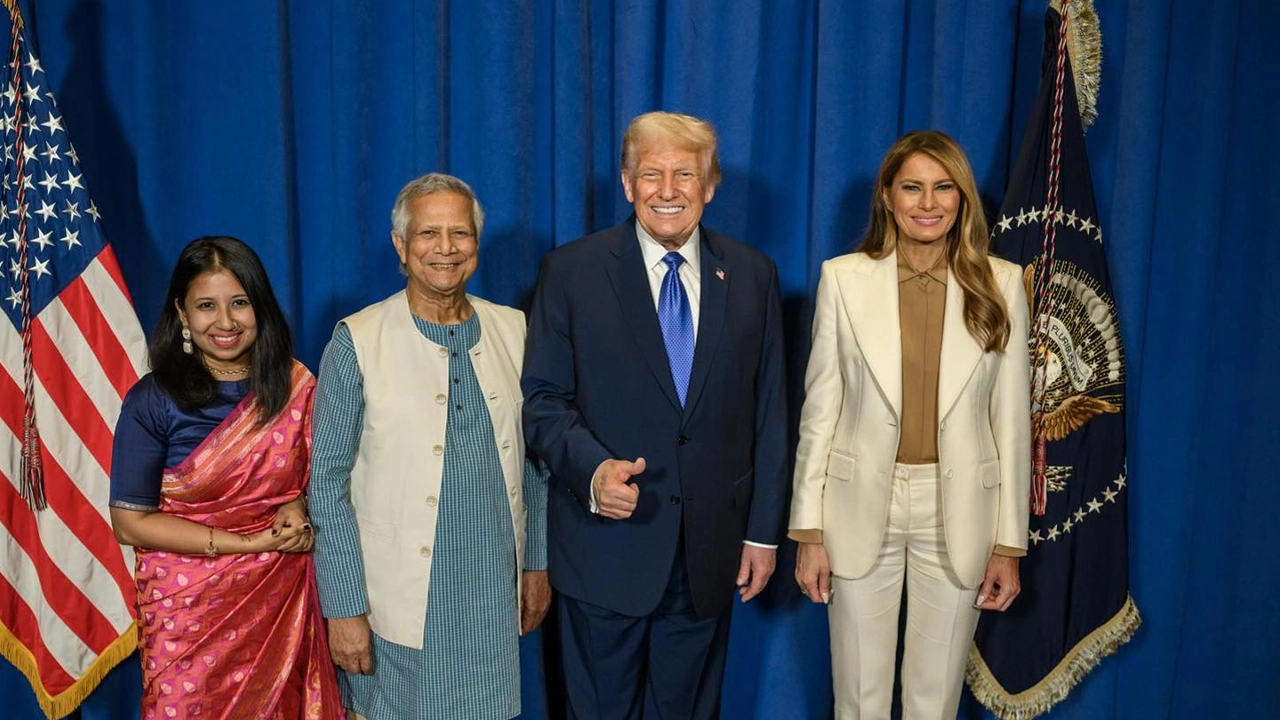 ছবিতে দেখা যায়, প্রেসিডেন্ট ট্রাম্প ও ফার্স্ট লেডি মেলানিয়া হাসিমুখে অধ্যাপক ইউনূস ও তার কন্যার পাশে দাঁড়িয়ে আছেন। আনুষ্ঠানিক পরিবেশের মধ্যেও ছবিটি যেন ছিল এক উষ্ণ বন্ধুত্বপূর্ণ মুহূর্তের প্রতিফলন।